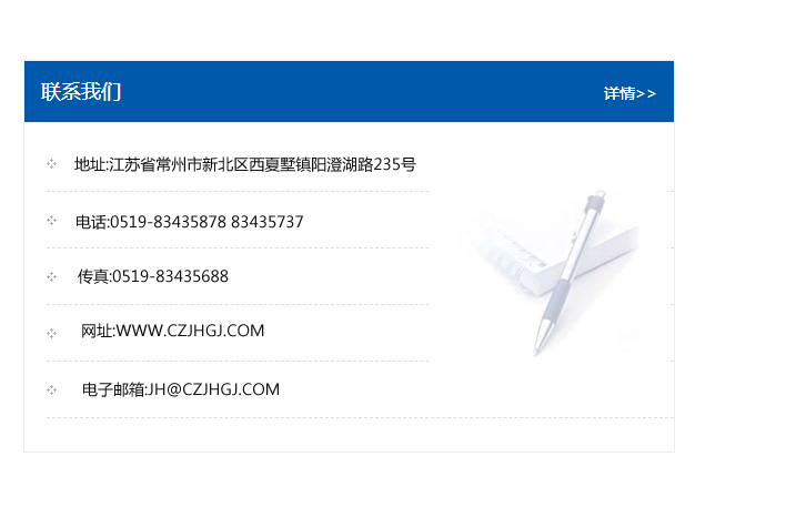 傳真:0519-83435688    郵編:213135    網址:WWW.czjhgj_com.xxjgy.com    電子郵箱:JH@czjhgj_com.xxjgy.com